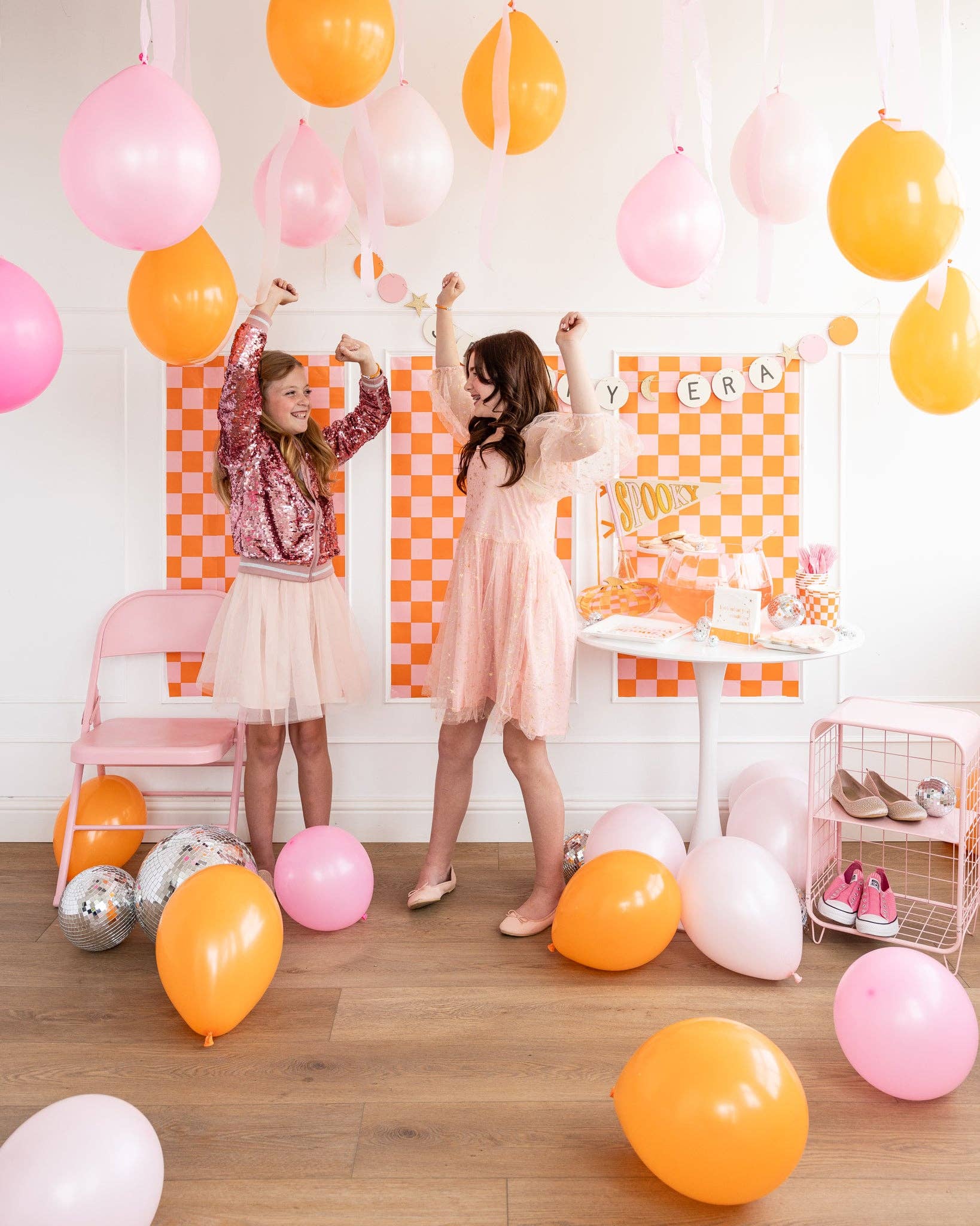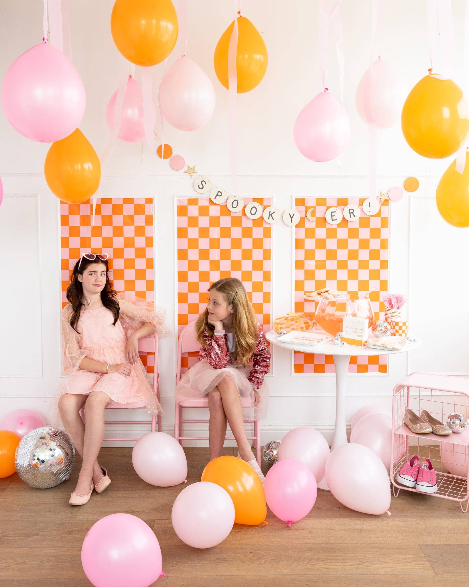 Spice up your Halloween party with a fun and festive checkered table runner in pink and orange. Add a pop of color and a touch of playfulness to your table setting, making it the perfect addition to any festive celebration.