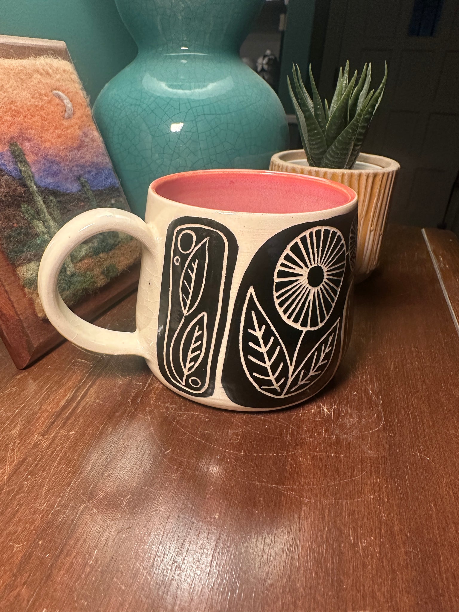 This handcrafted sgraffito mug is truly one of a kind. Made with high-quality materials and a unique sgraffito technique, each mug is a work of art. Perfect for enjoying your favorite hot beverage, this mug adds a touch of elegance and sophistication to your kitchen collection.