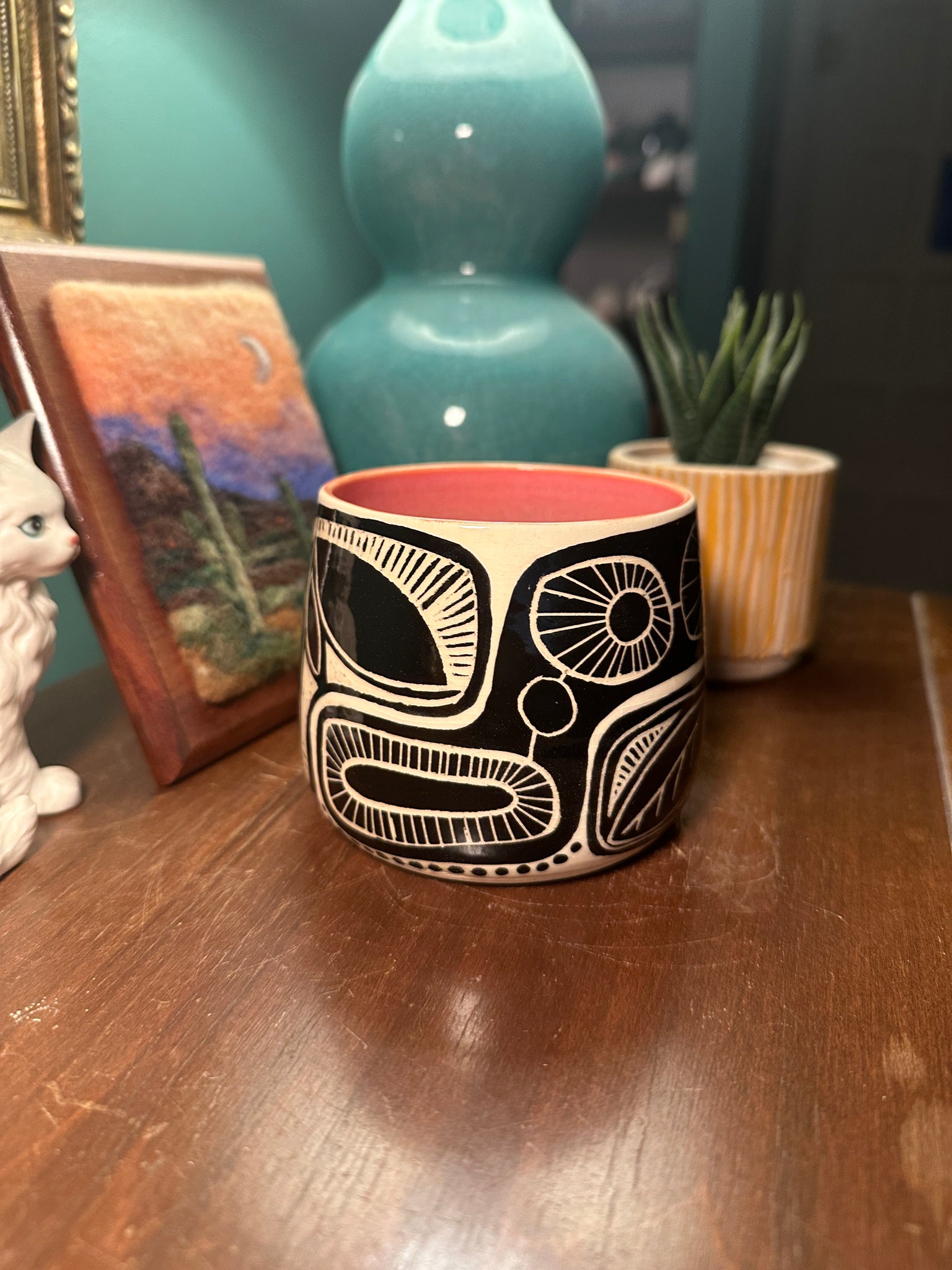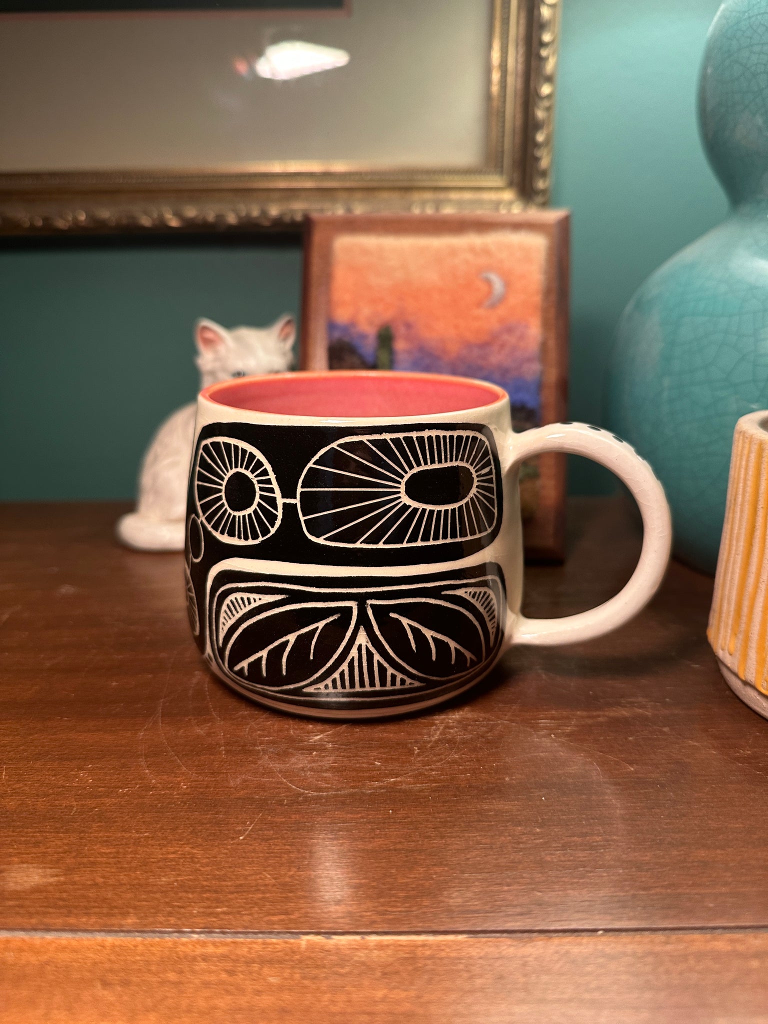 "Unleash your daring spirit with our limited edition Sgraffito mug #12. Each one is individually handmade, ensuring a one-of-a-kind work of art. Experience the thrill of owning a unique piece and add a touch of adventure to your daily coffee routine!"