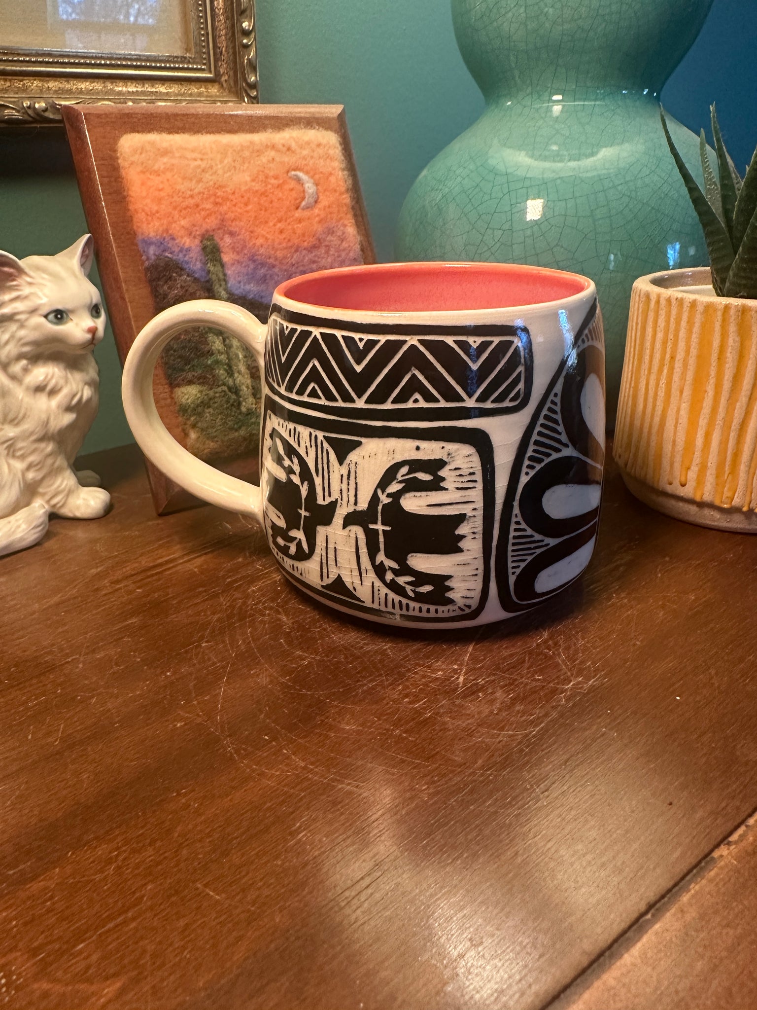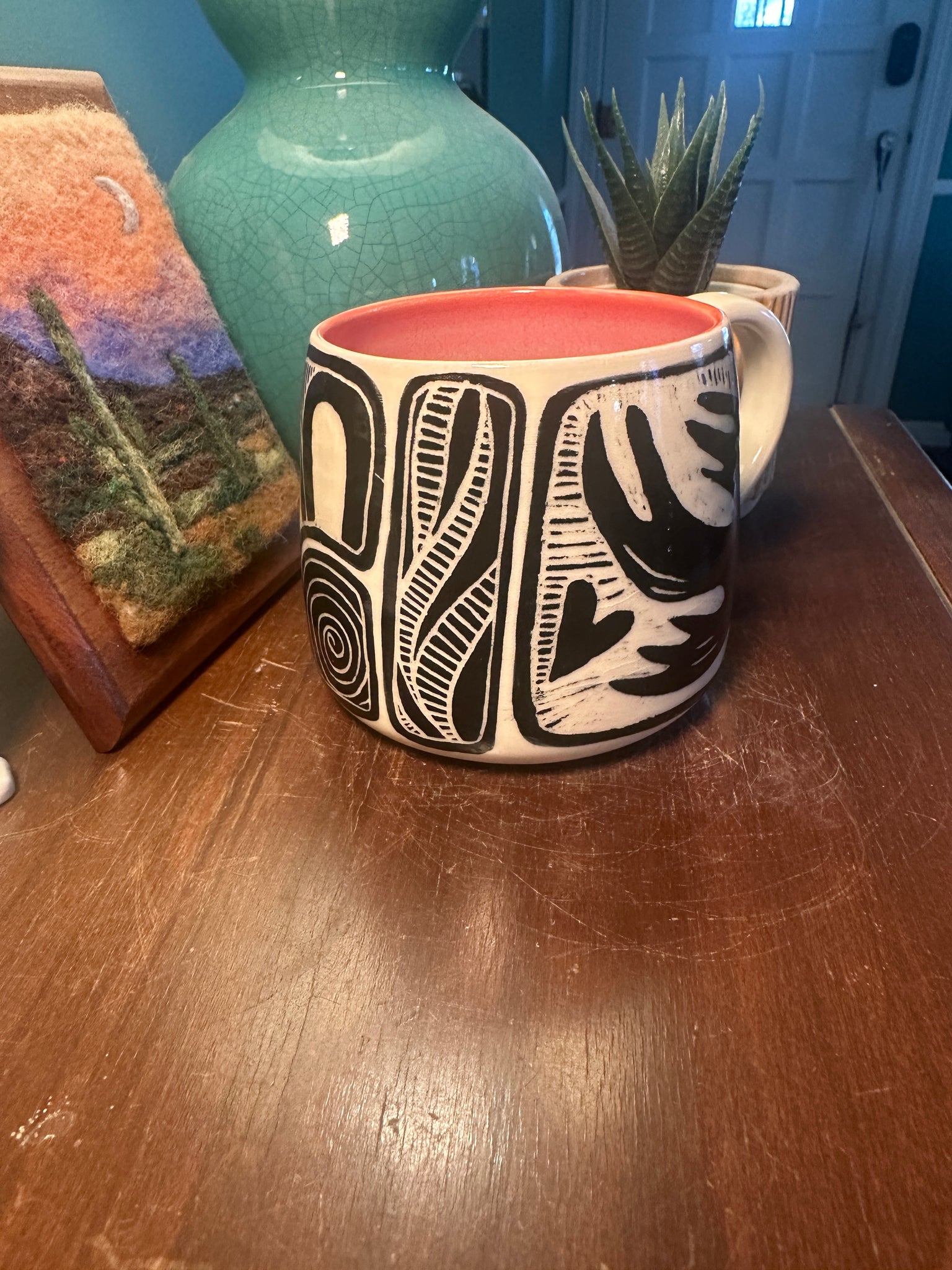 Add a touch of whimsy to your morning routine with our Sgraffito mug #25! Handmade with a unique bird design, this mug will bring a smile to your face while you savor your favorite hot beverage. Embrace playfulness with every sip.