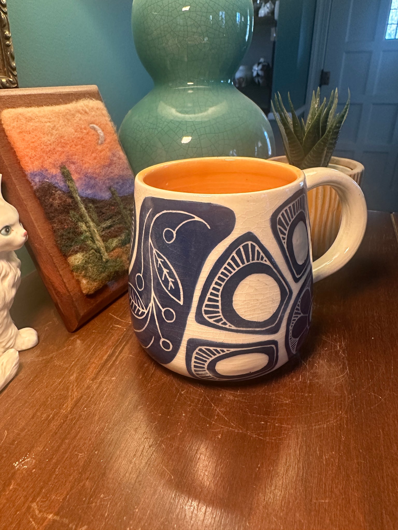 "Add some handmade charm to your morning routine with our sgraffito mug #26. Each mug is uniquely crafted, bringing a touch of whimsy to your coffee or tea time. Perfect for anyone who loves a little bit of quirkiness in their life! (Warning: drinking from this mug may make you feel extra special)."